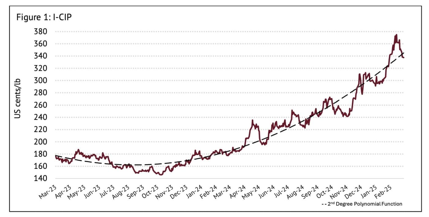 Năm 2025 mở đầu với giá cà phê tăng vọt, nhờ hạn hán kỷ lục tại Brazil và Việt Nam – hai quốc gia sản xuất 60% cà phê toàn cầu. Theo Bộ Nông nghiệp Mỹ (USDA), giá Arabica trên sàn ICE New York đạt đỉnh 410 cent/pound (khoảng 9.000 USD/tấn) vào quý I, tăng 15% so với cuối 2024, trong khi Robusta trên sàn London chạm 4.817 USD/tấn vào tháng 9. Tại Việt Nam, giá nội địa trung bình đạt 130.000 VNĐ/kg đầu năm, theo Giacaphe.com.