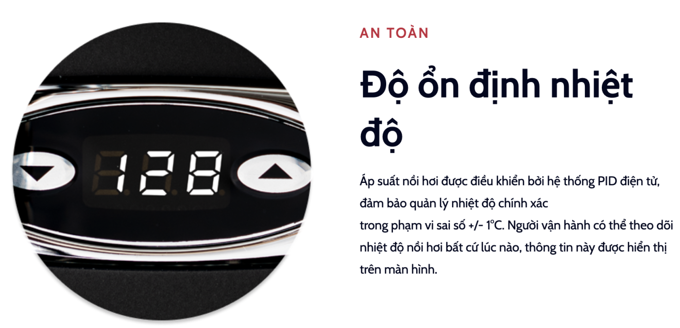 Đây là nâng cấp đáng giá nhất của Alex Leva. Máy cho phép bạn kiểm soát nhiệt độ nồi hơi một cách chính xác đến từng độ C thông qua màn hình kỹ thuật số. Điều này loại bỏ hoàn toàn sự phỏng đoán, giúp bạn có thể pha chế mọi loại hạt từ Dark Roast truyền thống đến Light Roast hiện đại mà không sợ bị cháy hay chua do sai lệch nhiệt độ.
