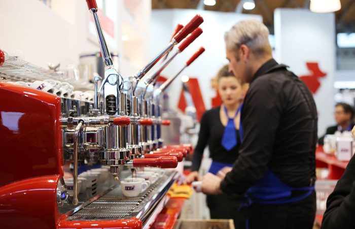 Đây là cảnh pha cà phê espresso bằng máy pha cà phê 5 nhóm Izzo tại gian hàng Izzo ở hội chợ thương mại SIGEP tại Ý.
