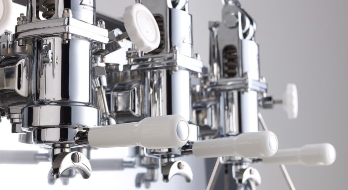 Máy được bao phủ hoàn toàn bằng thép không gỉ chất lượng cao, đánh bóng gương (Mirror finish). Thiết kế của Pompei không chạy theo xu hướng tối giản mà tôn vinh những đường nét cơ bắp. Các chi tiết như van hơi, vòi nước nóng và đặc biệt là 3 cần gạt thép vươn cao kiêu hãnh tạo nên một diện mạo vô cùng quyền lực.