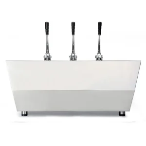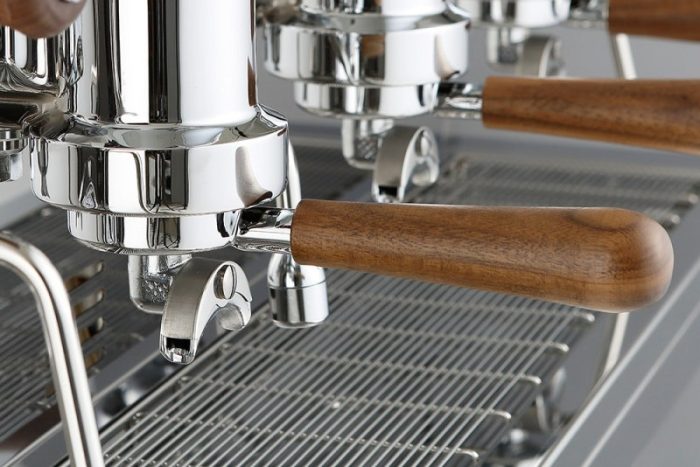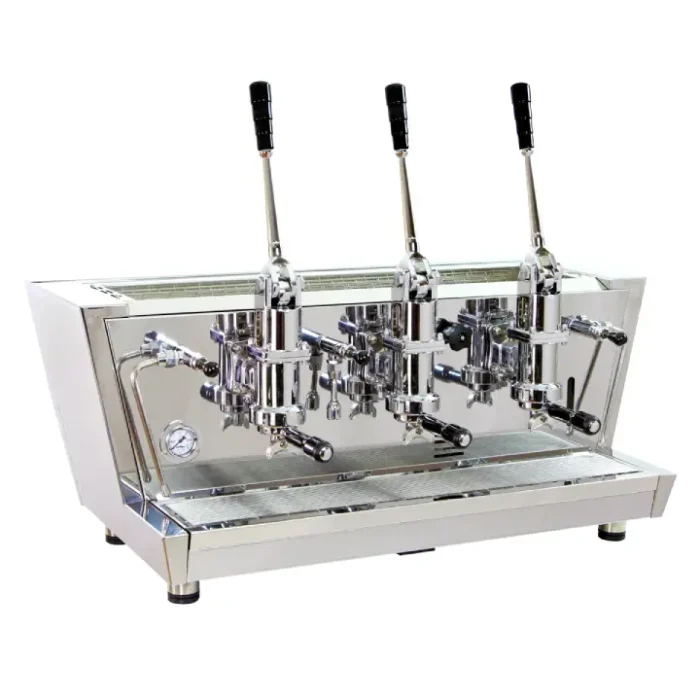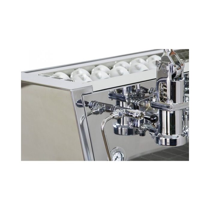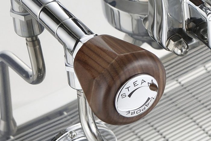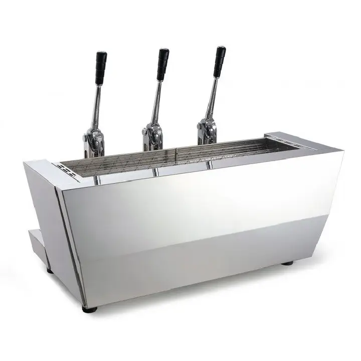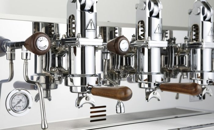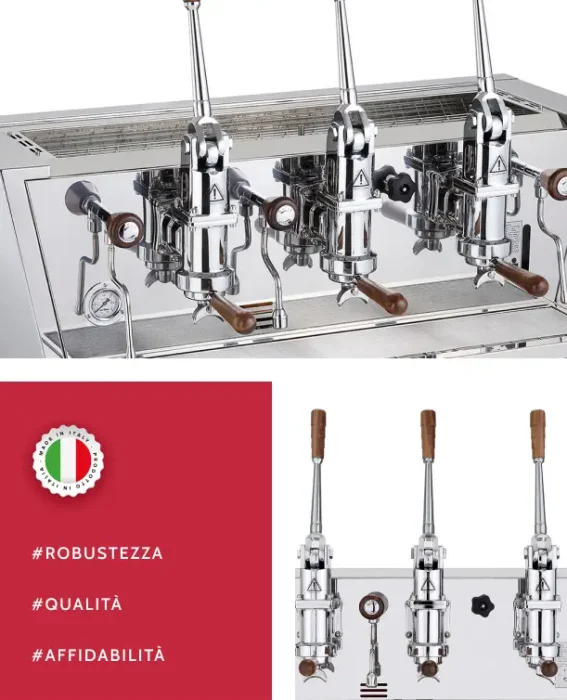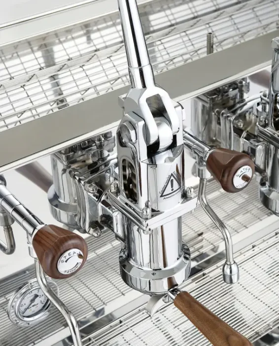 Điểm nhấn lớn nhất của Valchiria chính là 3 cụm Grouphead được thiết kế lộ hoàn toàn ra ngoài. Các chi tiết này được mạ Chrome bóng loáng, kết hợp với các cần gạt thép vươn cao, tạo nên một hiệu ứng thị giác cực kỳ ấn tượng. Khách hàng sẽ bị thu hút ngay lập tức bởi sự chuyển động nhịp nhàng của các cần gạt khi Barista thao tác.