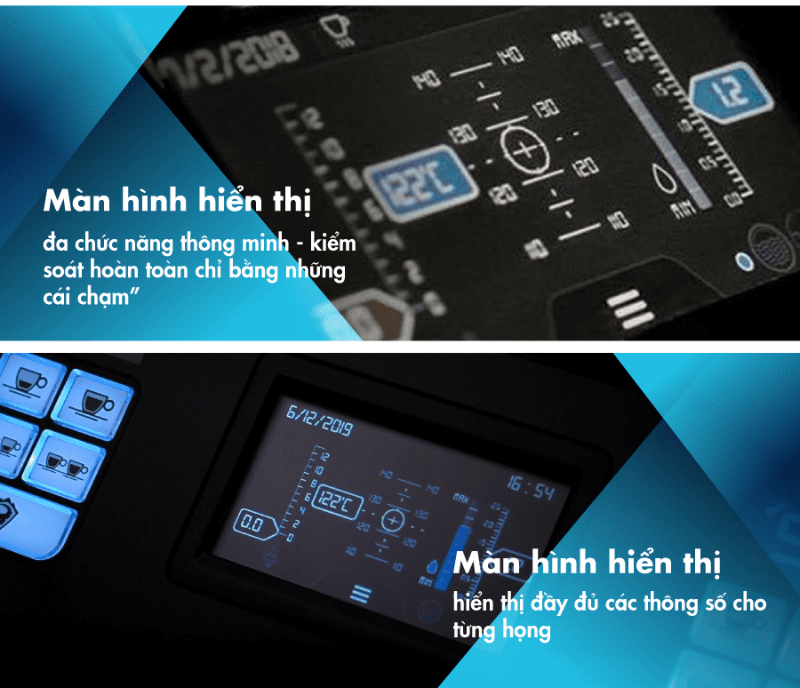 Bên cạnh đó, bạn hoàn toàn có thể cài đặt các chức năng tự động như vệ sinh tự động, bật/tắt máy, thiết lập thông số cho từng họng pha, kiểm tra/điều chỉnh nhiệt độ, áp suất,… một cách dễ dàng.