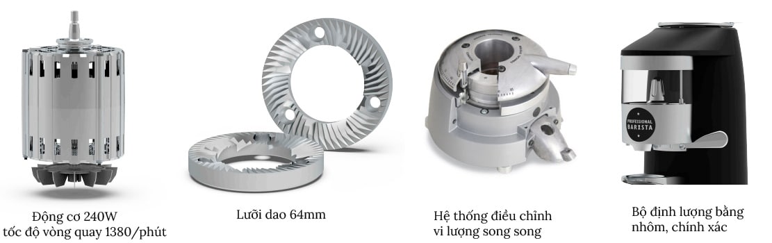 Lưỡi dao này đảm bảo tạo ra kích thước hạt chính xác cho Espresso và năng suất xay ấn tượng 7g trong 2,1 giây. Nhờ được xử lý mài mòn kỹ lưỡng, giúp tăng tuổi thọ cho lưỡi dao, đảm bảo hiệu suất tối ưu và hạn chế mài mòn trong suốt quá trình vận hành máy. Độ bền lưỡi dao ước tính lên đến 500kg.