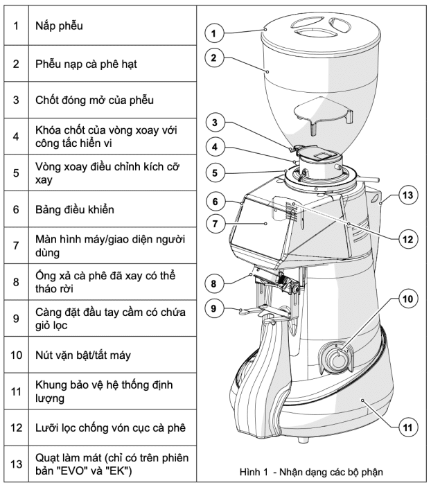 Với hình ảnh tham chiếu Hình 1 tất cả các loại máy xay cà phê tự động định lượng dòng XGi sẽ có các phần chính sau: