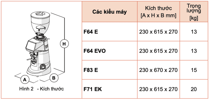 Các bảng sau cho biết kích thước tổng thể và các đặc tính kỹ thuật chính của dòng máy xay cà phê tự động định lượng ON DEMAND.
